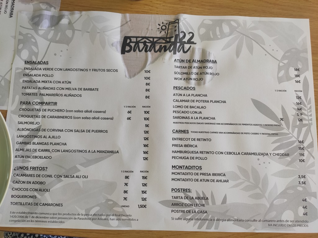 El sitio se llama «Baranda 22», uno de los chiringuitos del Palmar, en primerísima línea de playa, con un ambiente genial y una comida que quita el «sentío», con una comida basada en el atún rojo de la zona y en el pescaíto fito típico de nuestra zona.