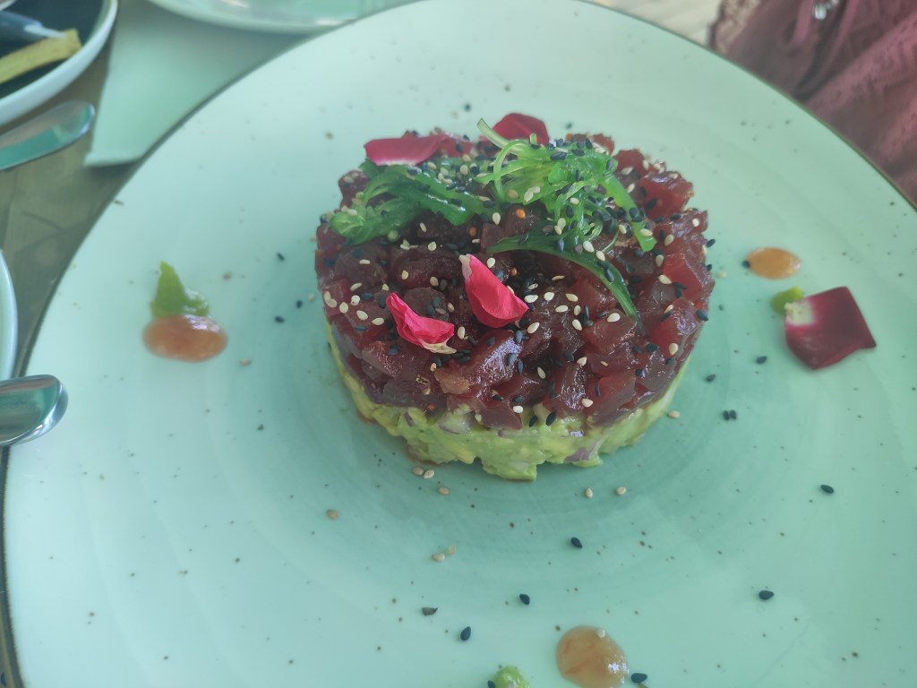 Como sugerencia os recomiendo las croquetas de carabinieros con ali oli, que tienen un sabor espectacular. Os recomendaría también las sardinas a la plancha, que son diferentes a los espetos típicos de la provincia de Málaga por ejemplo, los boquerones y por supuesto las tortillitas de camarones, y la especialidad de la zona, el atún rojo. El tartar de atún una exquisitez, con sabores cítricos, una fusión muy buena con la cocina oriental.