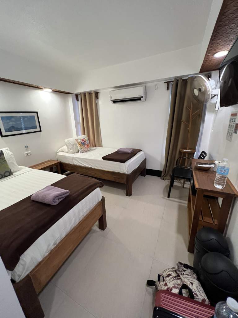 En Coron nos alojamos en el Hotel Vela Terraces, a cinco minutos del centro del pueblo en triciclo. Moderno y cómodo, con personal muy amable. La zona es muy tranquila para dormir. Las habitaciones grandes y cómodas. El único pero es que no tiene ascensor y nos tocó arriba del todo, como la tercera planta más o menos.
