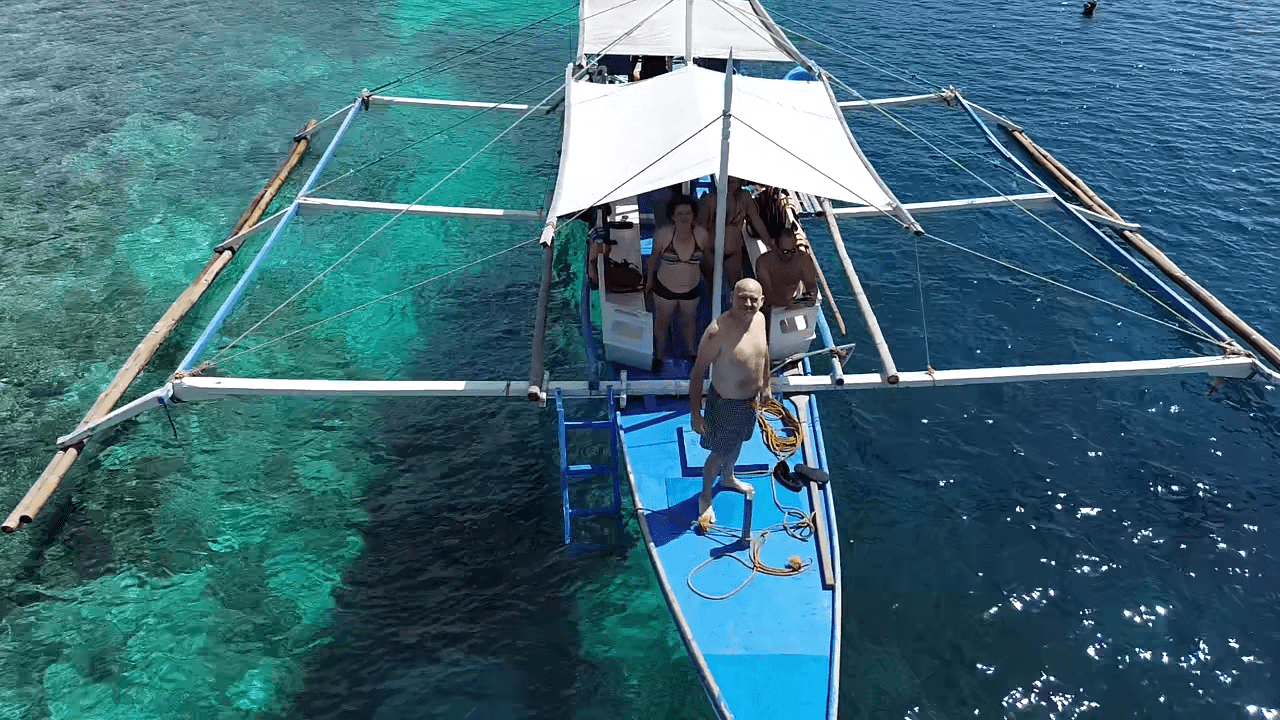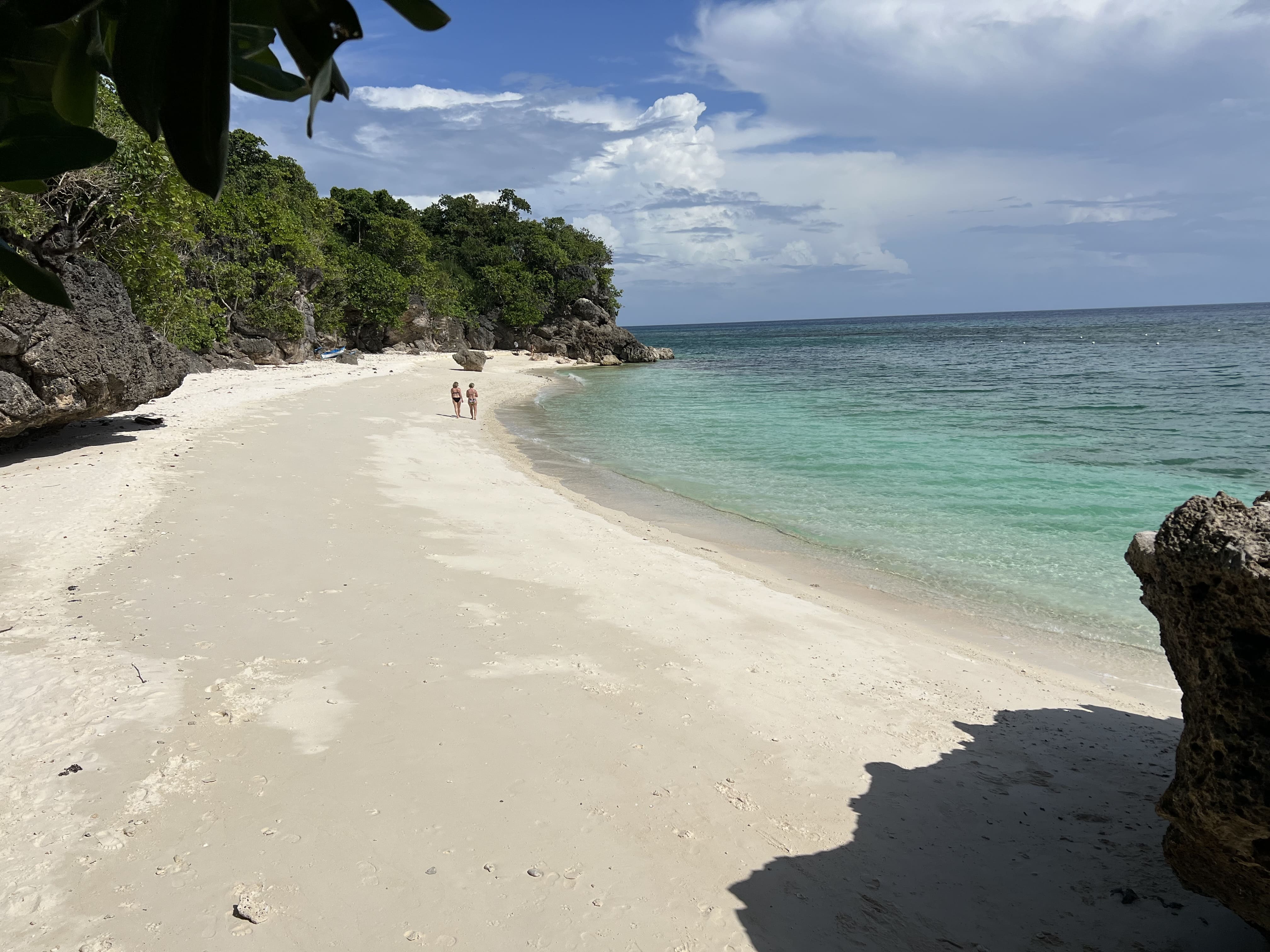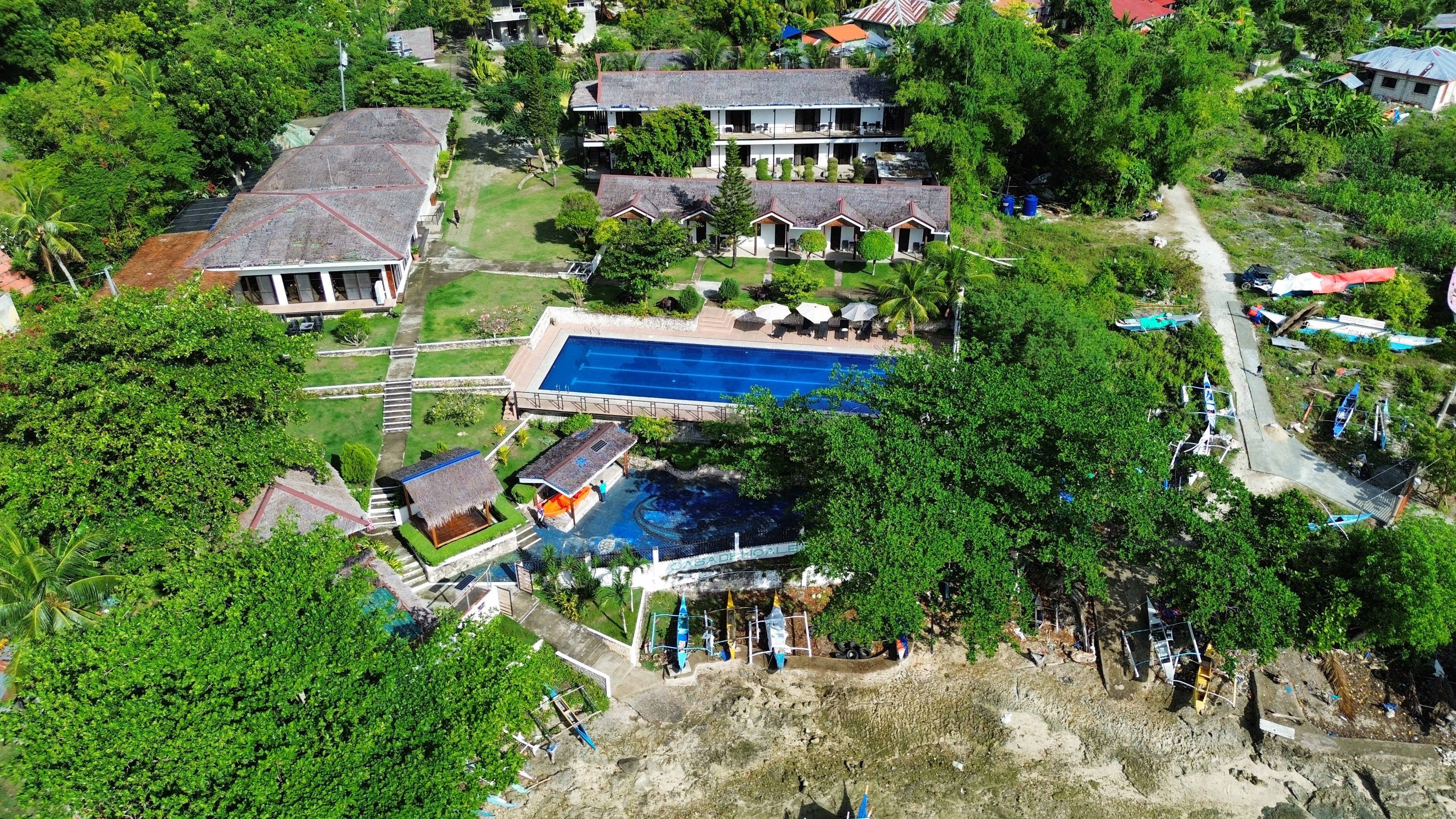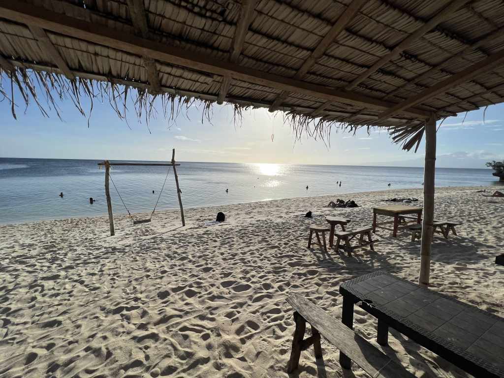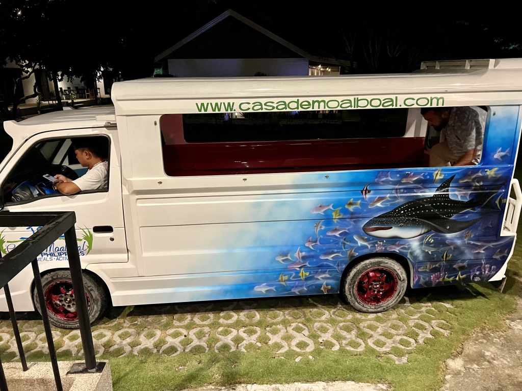En Moalboal nos alojamos en Casa Moalboal, un sitio que nos gustó muchísimo, pues es una especie de resort con piscina, donde se respira una calma total. Todo muy limpio y el personal muy amable. Se encuentra en una ubicación muy buena, a cinco minutos del pueblo en triciclo o Jeepney, que puedes pedir en el mismo hotel, ya que ofrecen este servicio por unos 300 pesos el trayecto. Está en primera línea de playa y con acceso a lugares de buceo de renombre, como Tongo point, que está justo al lado. El hotel tiene acceso a la playa, pero con marea baja es un poco complicado, ya que está lleno de rocas.