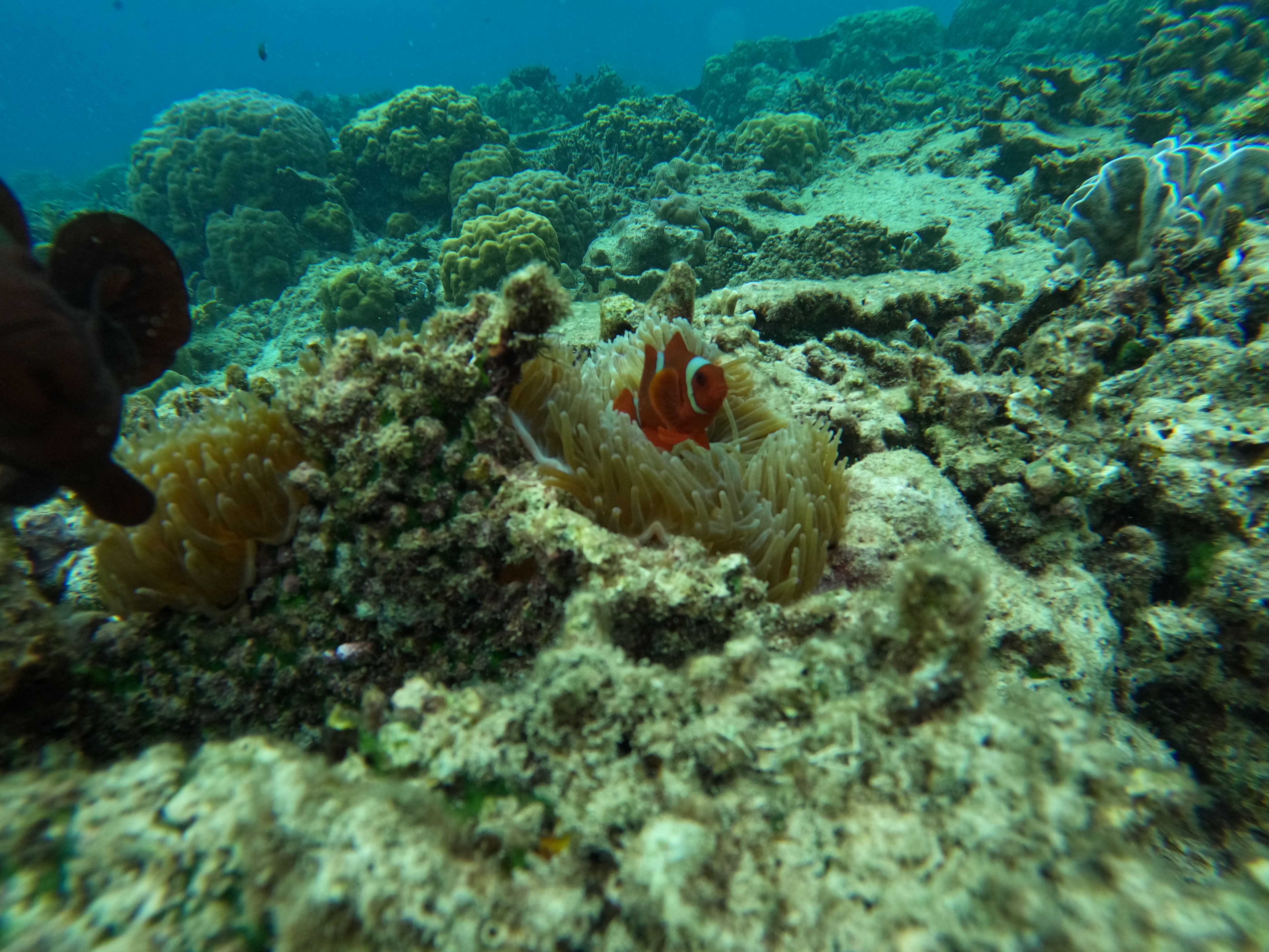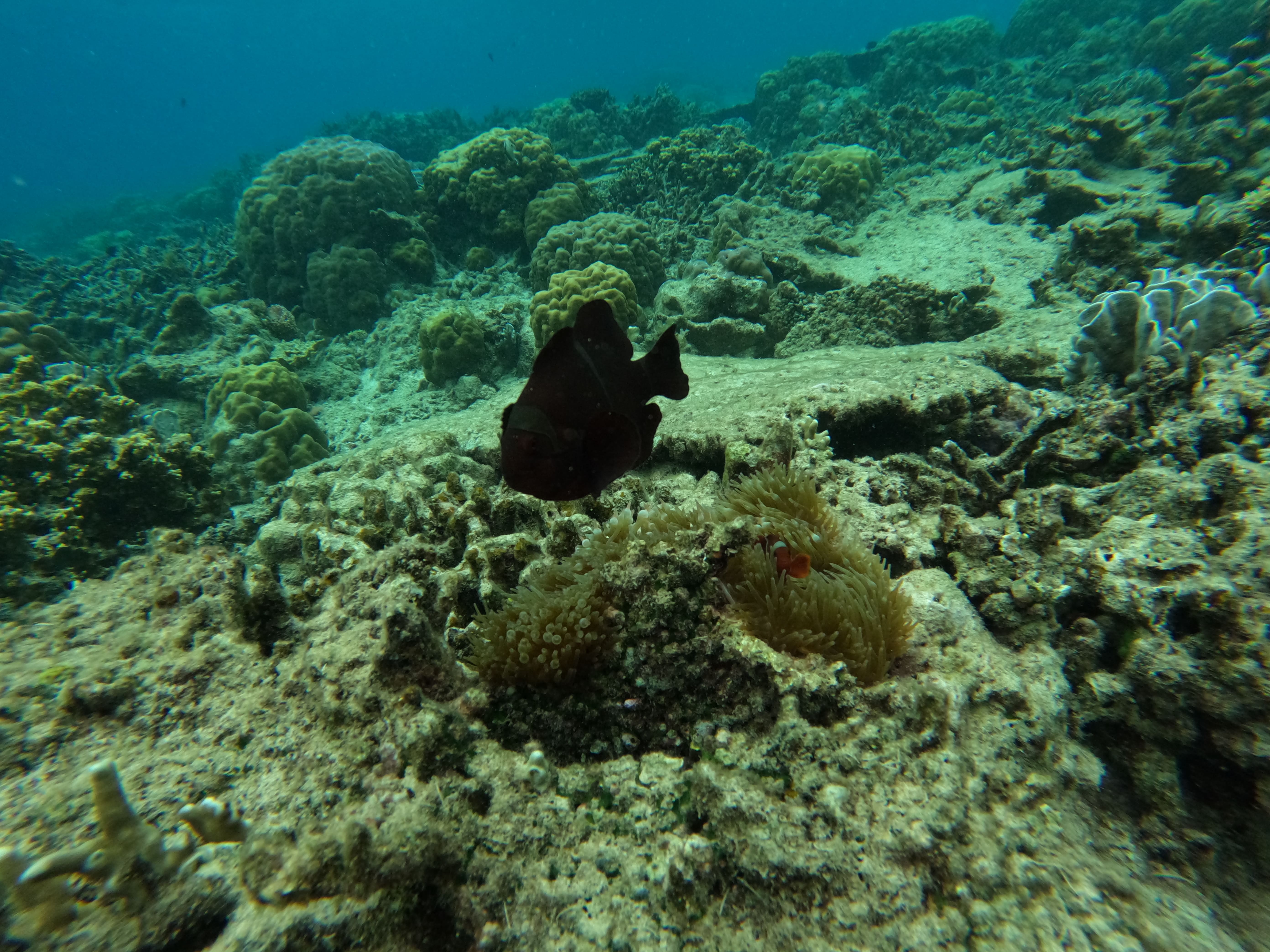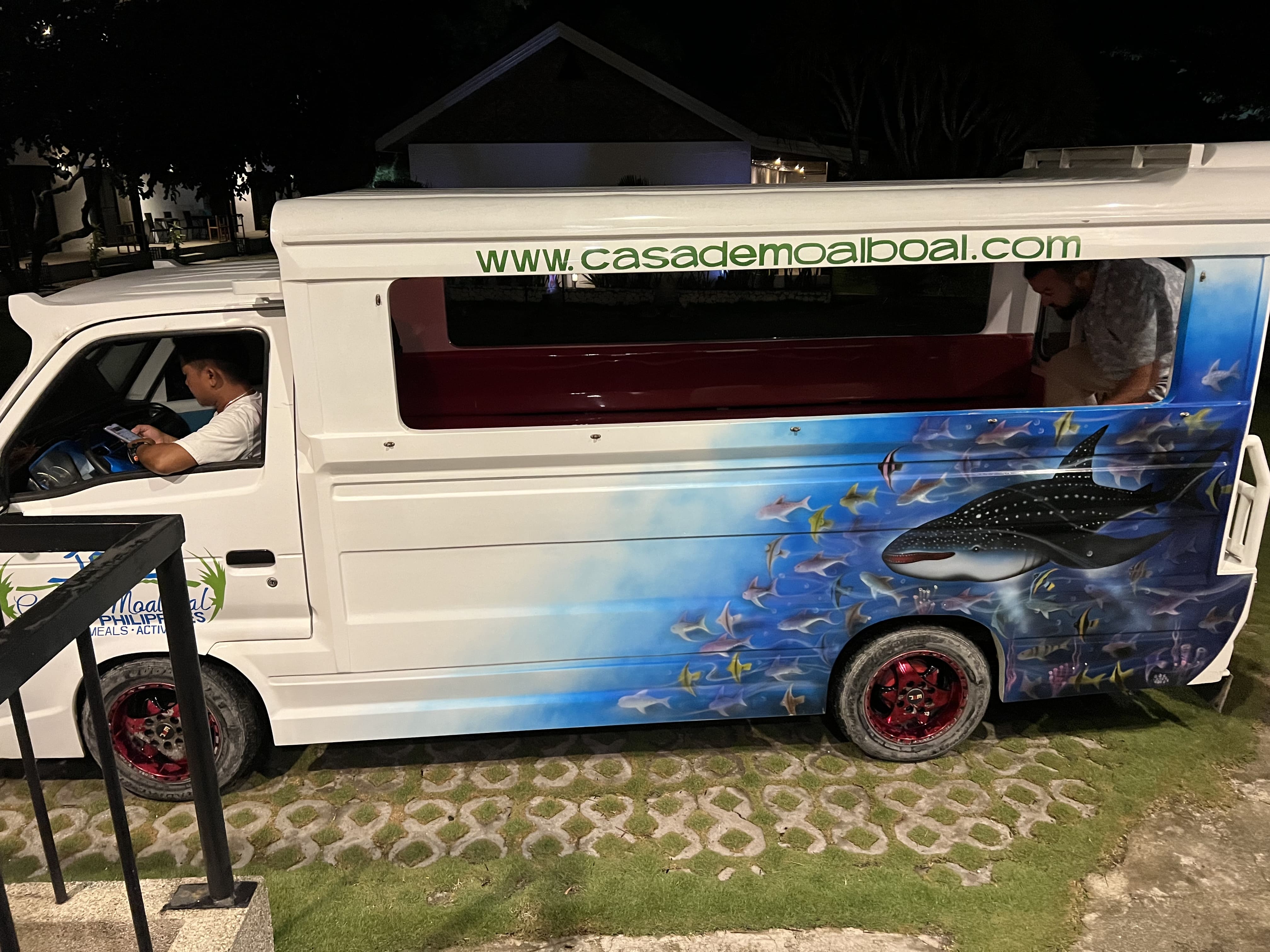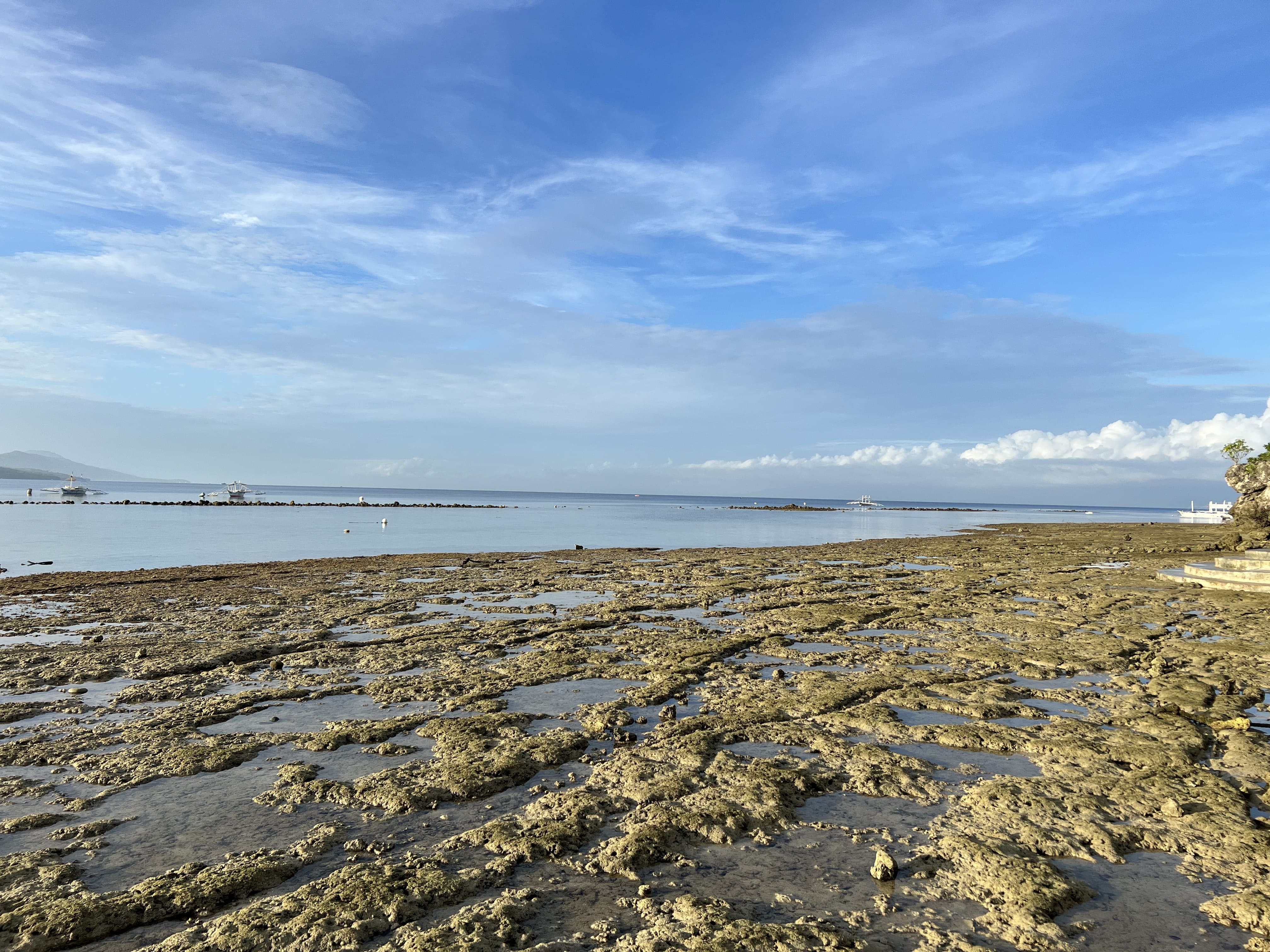 En Moalboal nos alojamos en Casa Moalboal, un sitio que nos gustó muchísimo, pues es una especie de resort con piscina, donde se respira una calma total. Todo muy limpio y el personal muy amable. Se encuentra en una ubicación muy buena, a cinco minutos del pueblo en triciclo o Jeepney, que puedes pedir en el mismo hotel, ya que ofrecen este servicio por unos 300 pesos el trayecto. Está en primera línea de playa y con acceso a lugares de buceo de renombre, como Tongo point, que está justo al lado. El hotel tiene acceso a la playa, pero con marea baja es un poco complicado, ya que está lleno de rocas.